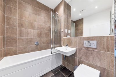 - Bathroom with bath/shower above, wk., hand basin and heated towel rail.