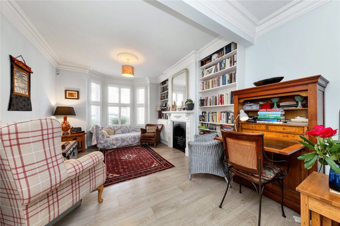 • Spacious Sitting Room with bay window, feature fireplace, fitted cupboards and shelving to alcoves and wood effect flooring